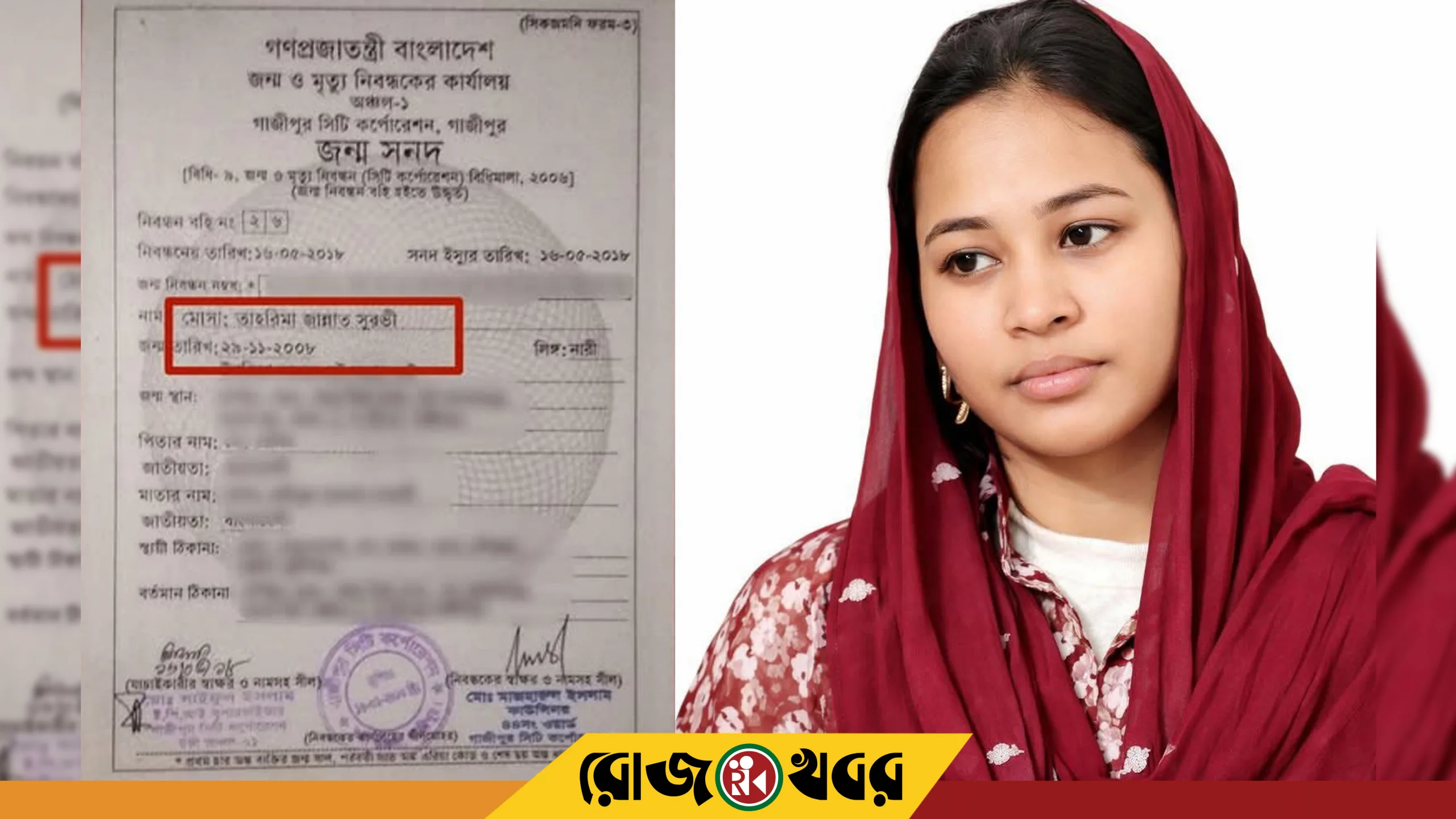 গাজীপুর সিটি কর্পোরেশন থেকে প্রাপ্ত জন্ম নিবন্ধন সনদ অনুযায়ী তাহরিমার বয়স ১৭ বছর এক মাস। তবে পুলিশের তদন্ত অফিসার আদালতে